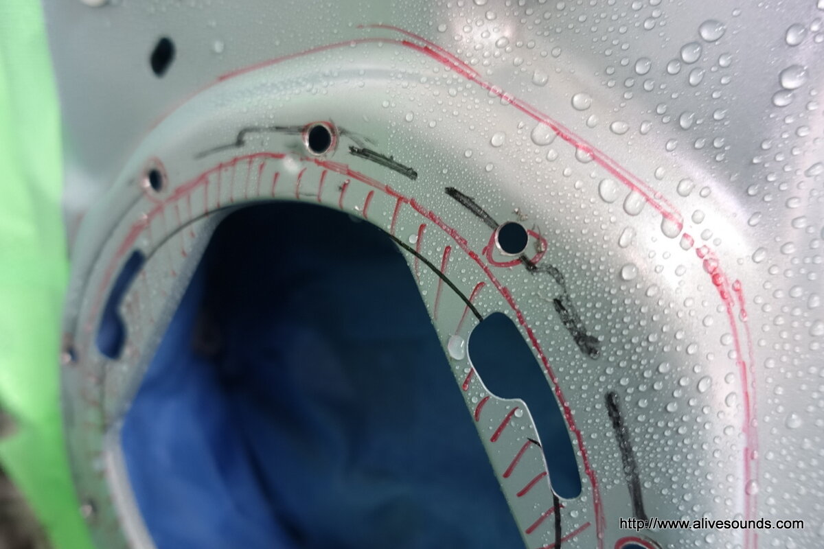 スピーカーの口径よりもかなり小さく、この状態ではスピーカー裏の背圧の抜けが悪くスピーカーのクオリティーを下げる要因の一つです。