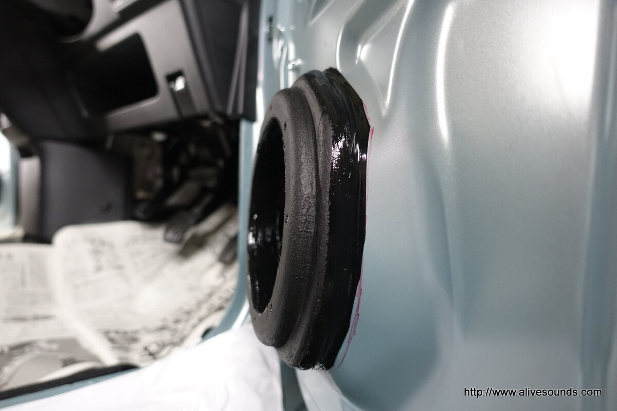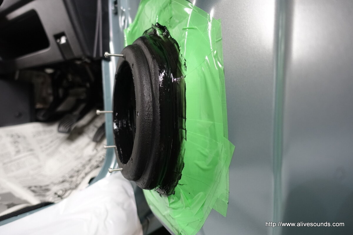 スーパーインナーバッフル周囲の隙間にもコーキング材を塗り込みます。