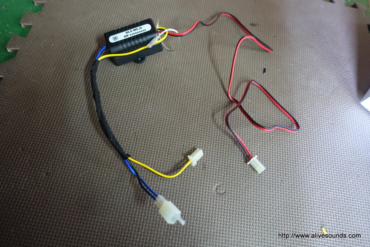 M6.2iのパッシブネットワークは簡易タイプなので純正スピーカーケーブルに割り込ますような方法で接続します。